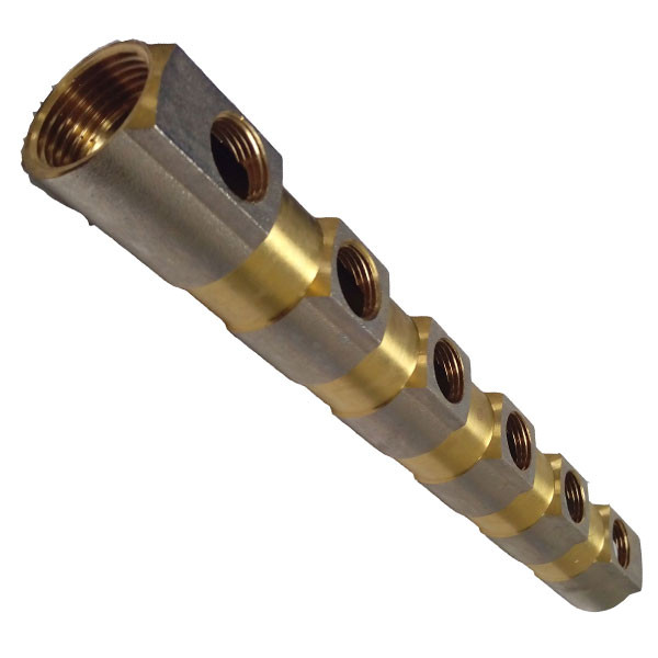 کلکتور 6 انشعاب پله ای که با دو ورودی از چپ و راست کلکتور و با انشعاب ورودی 1 اینچ و دارای 6 انشعاب خروجی از بالای کلکتور با سایز 1/2 اینچ استاندارد و با وزن مناسب جهت لوله کشی آب سرد و گرم در لوله کشی 5 لایه مورد مصرف قرار می گیرد و بصورت تو پیچ طراحی گردیده است ، استفاده از کلکتور در لوله کشی آب سرد و گرم ساختمان باعث توزیع یکنواخت فشار آب و تعمیرات راحت تر و باعث عدم قطع انشعابات سالم اب در مواقع تعمیرات مورد نیاز می گردد